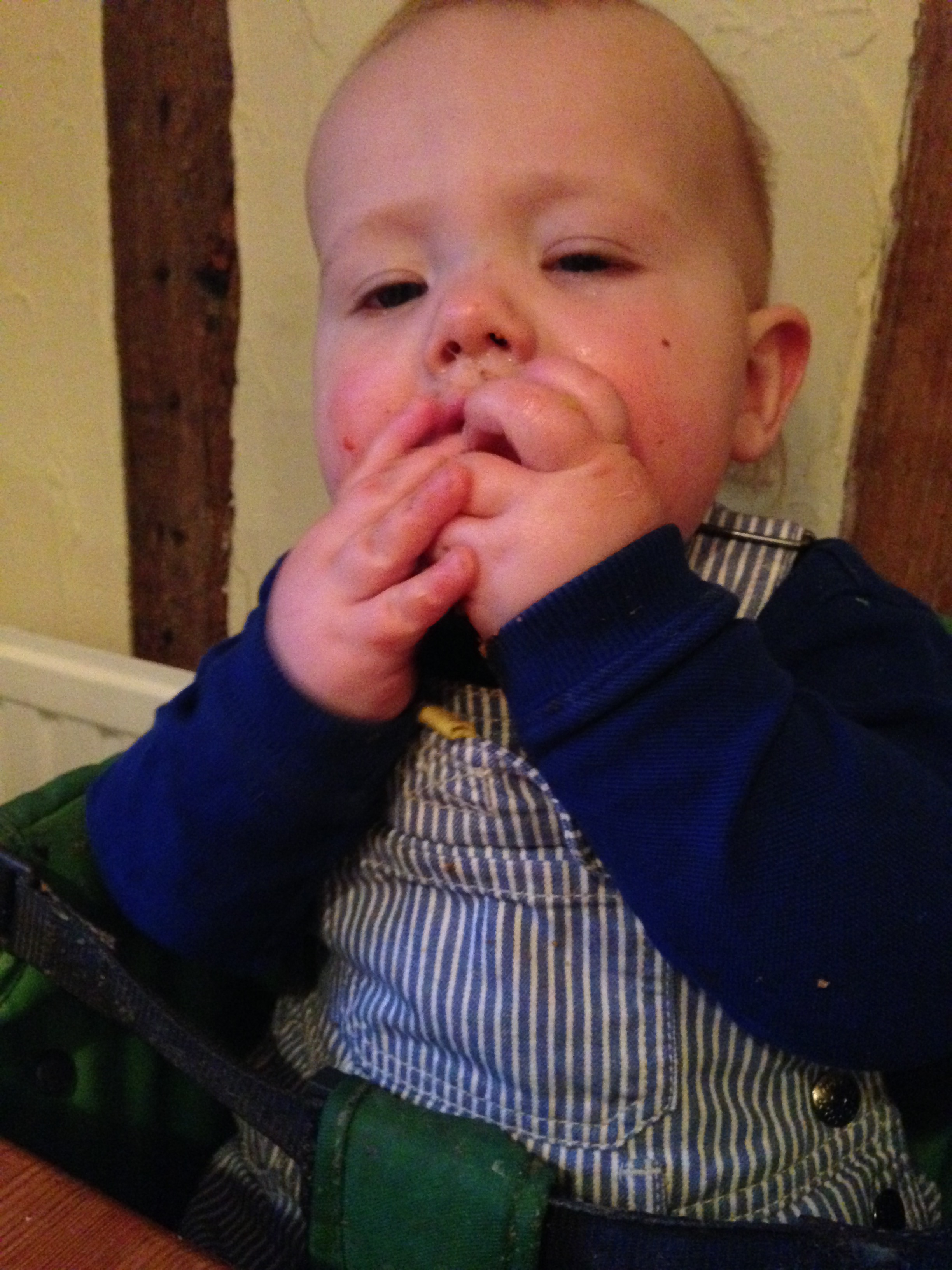 The first night we had this with pasta, parmesan and salad (because everyone knows how much babies love salad). Tonight we had it with four-veg mash* and peas. Bert rejects cooked peas. He eats them frozen from a small bowl on the kitchen floor. Don’t ask me. Babies are eccentric, lawless creatures.